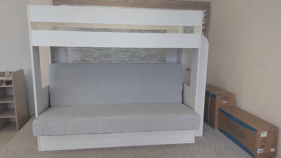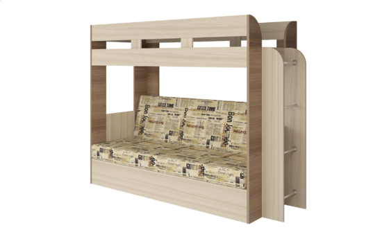 Кровать детская двухъярусная Карамель 75 Дуб Сонома, диван - велюр Газета (сборка на любую сторону) спальное место верх 80х190, низ 120х185