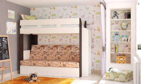 Кровать детская двухъярусная Карамель 75 анкор светлый бодега темный, диван - велюр Саванна (сборка на любую сторону) спальное место верх 80х190, низ 120х185