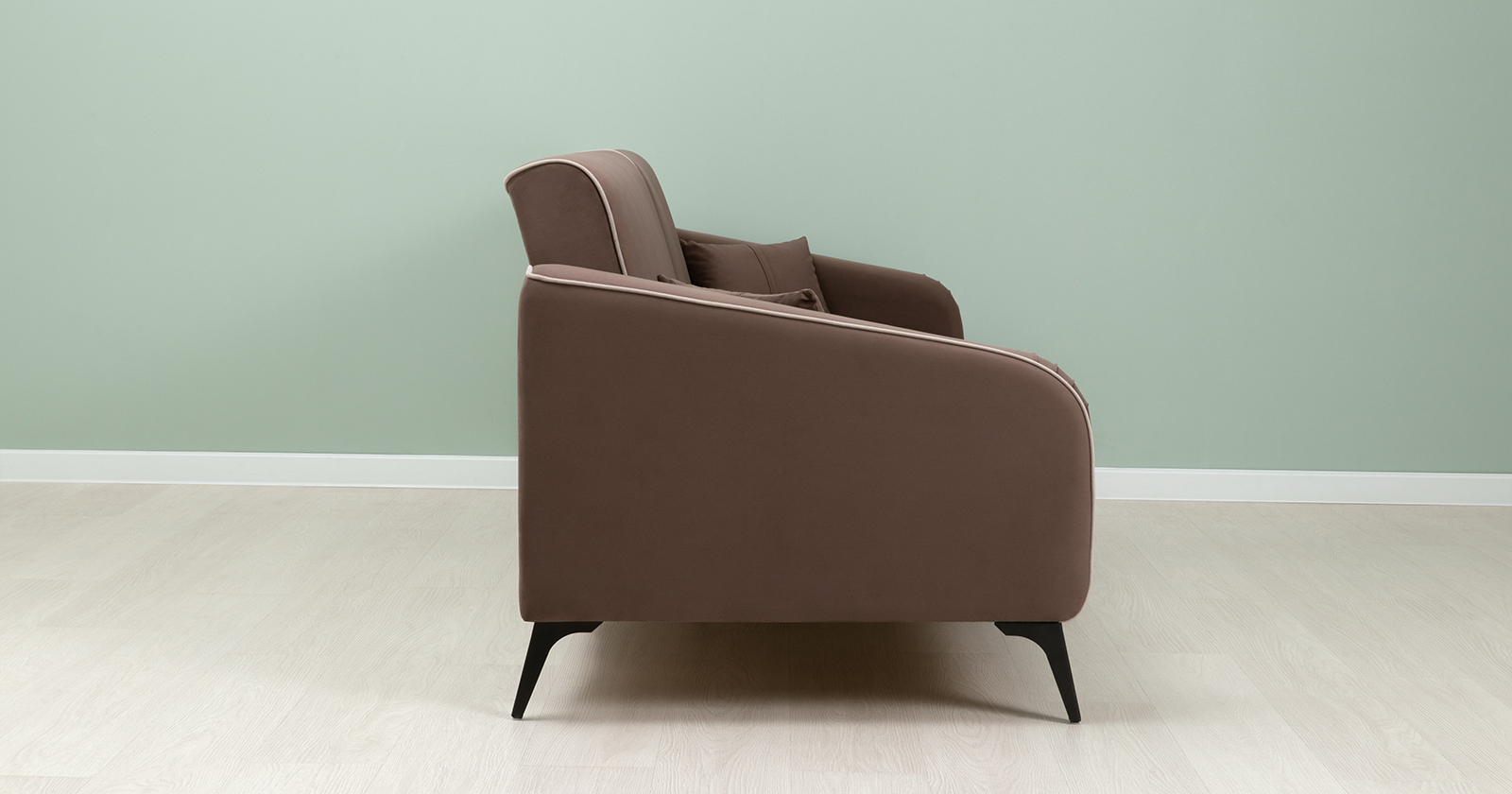 Спинка и сиденье разделяются пополам двойным кантом по центру и одинарным по краям сидения, для придания одной единой формы. Подлокотники с изгибом на лицевой стороне и мягкими закругленным углом со складками, с выраженным контрастным ровным кантом по внешнему контуру изделия и изогнутой линией канта.