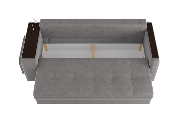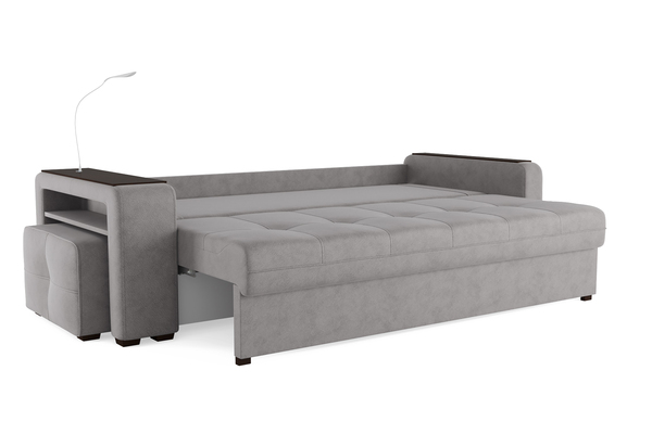 Диван «SMART 4» — это не просто мягкая мебель, а один из ключевых элементов интерьера с обширным функционалом, где эстетика тесно соседствует с комфортом и эргономичностью.  Одна боковина оснащена карманом для хранения мелочей и гаджетов, другая боковина совмещает одновременно: рабочую поверхность, за счет широкой накладки, двойной  usb - порт  и портативную лампу точечного света, которая входит в комплект. Добавить контрастных деталей в интерьер поможет пуф, интегрированный в подлокотник. Этот вариант для современных людей, которые ценят комфорт и удобство отдыха. Мягкое сиденье с легкостью трансформируется в просторное спальное место, на котором смогут утроиться ваши гости. Стильный и уютный, он станет отличным решением, если вы ищите не только красоту, но и комфорт.