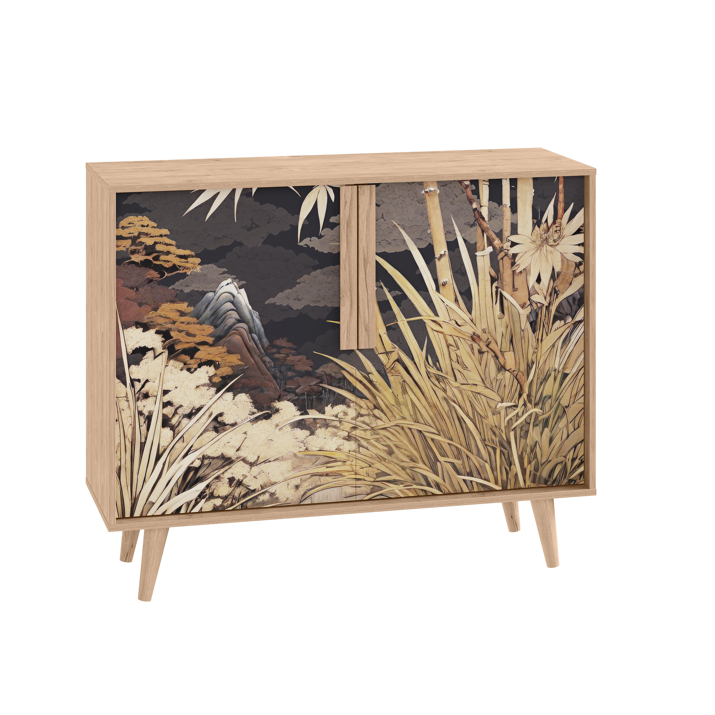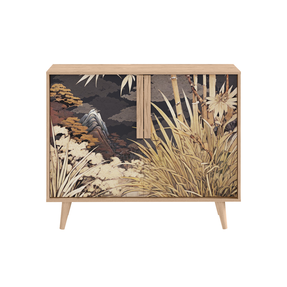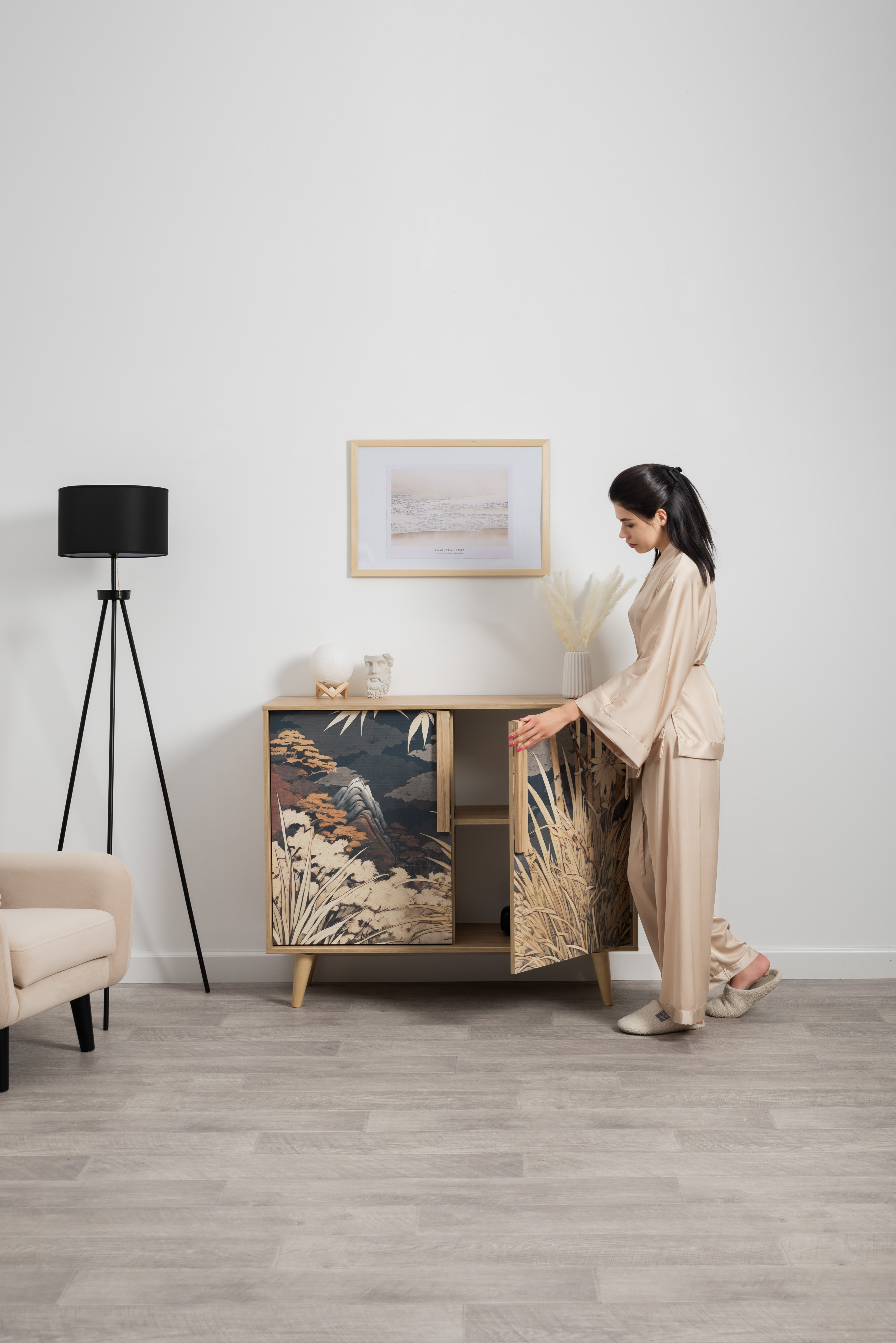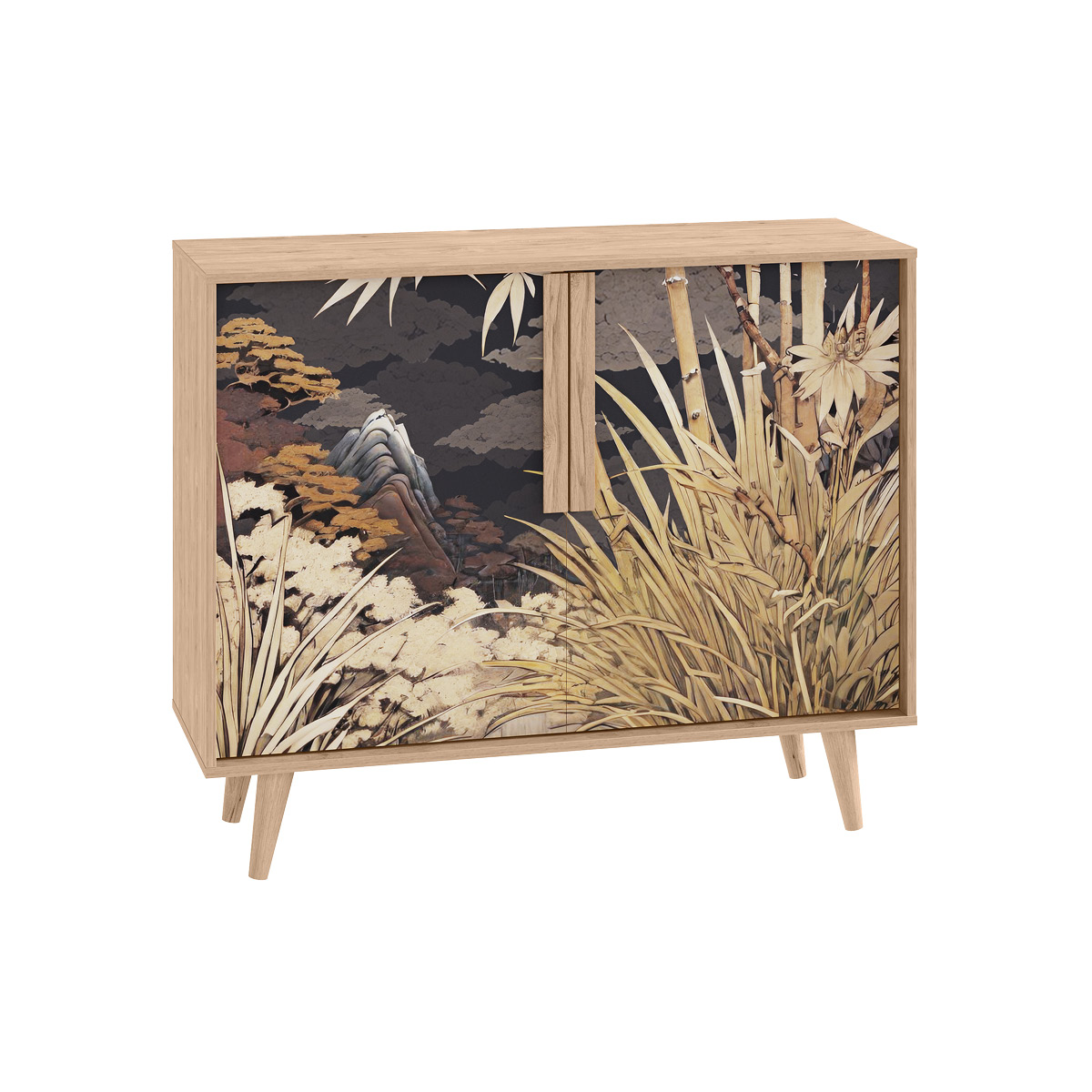 Комод Току 16.230.04 украшают фасады с фотопечатью в восточном стиле, и дополняют ручки и опоры из массива дерева. Вместительные отделения со съемными регулируемыми полками обеспечивают удобное хранение, а углубленные фасады придают конструкции стильную глубину.
