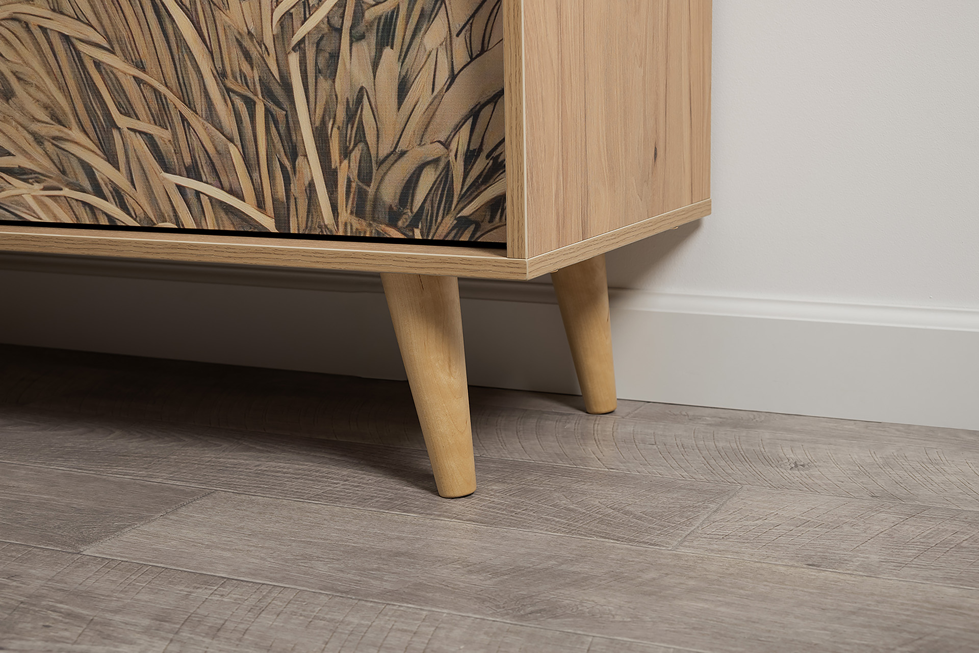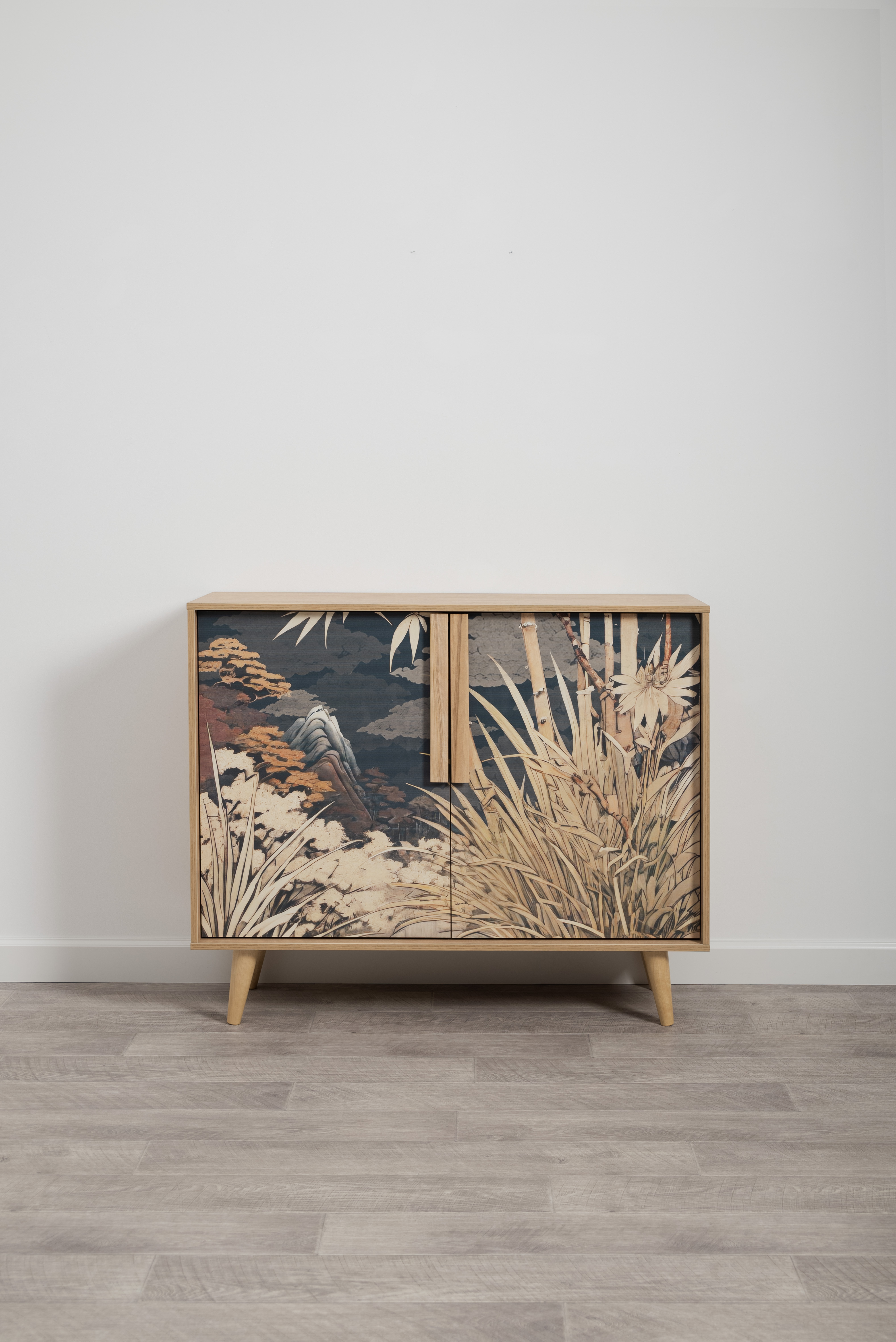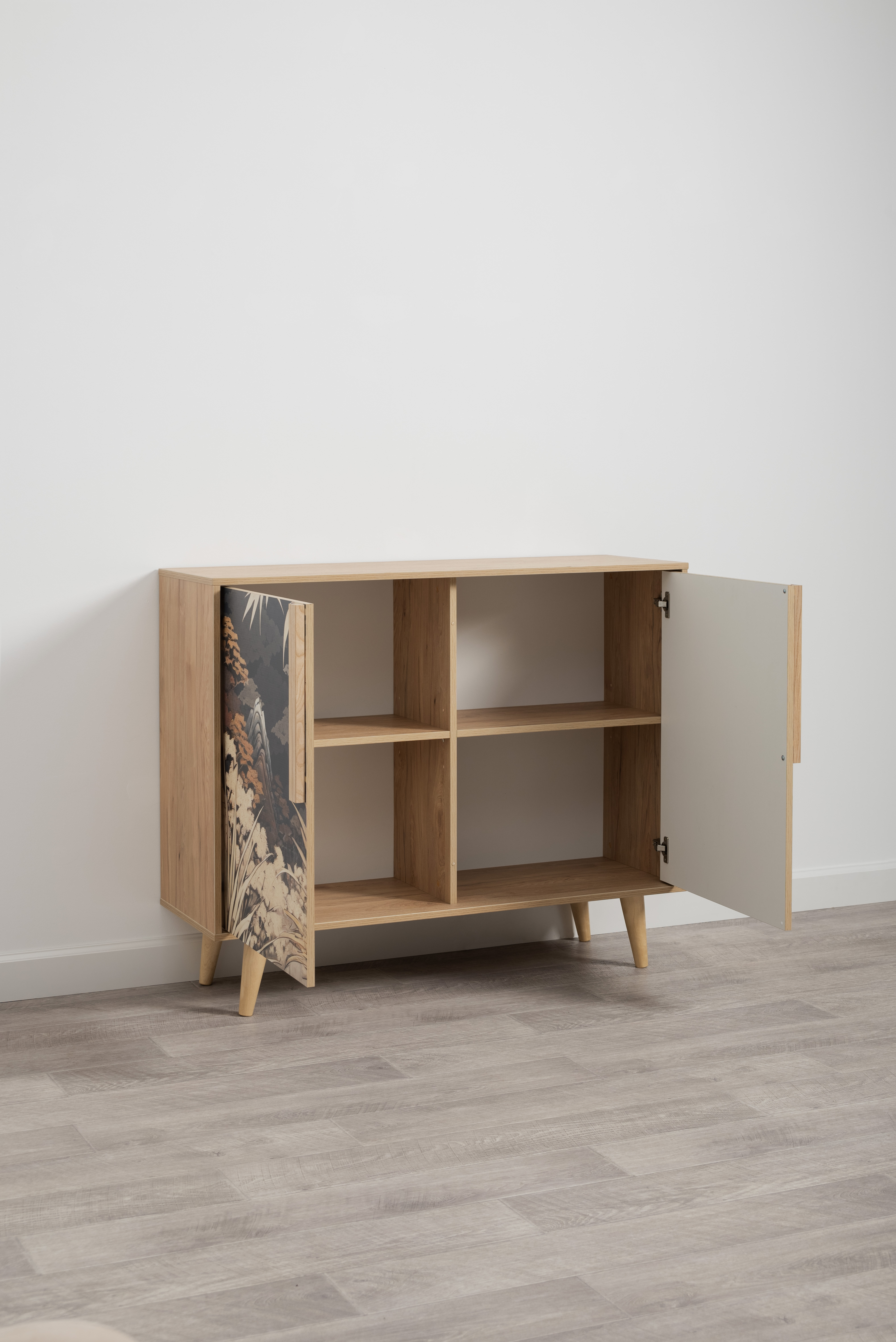 Комод Току 16.230.04 украшают фасады с фотопечатью в восточном стиле, и дополняют ручки и опоры из массива дерева. Вместительные отделения со съемными регулируемыми полками обеспечивают удобное хранение, а углубленные фасады придают конструкции стильную глубину.