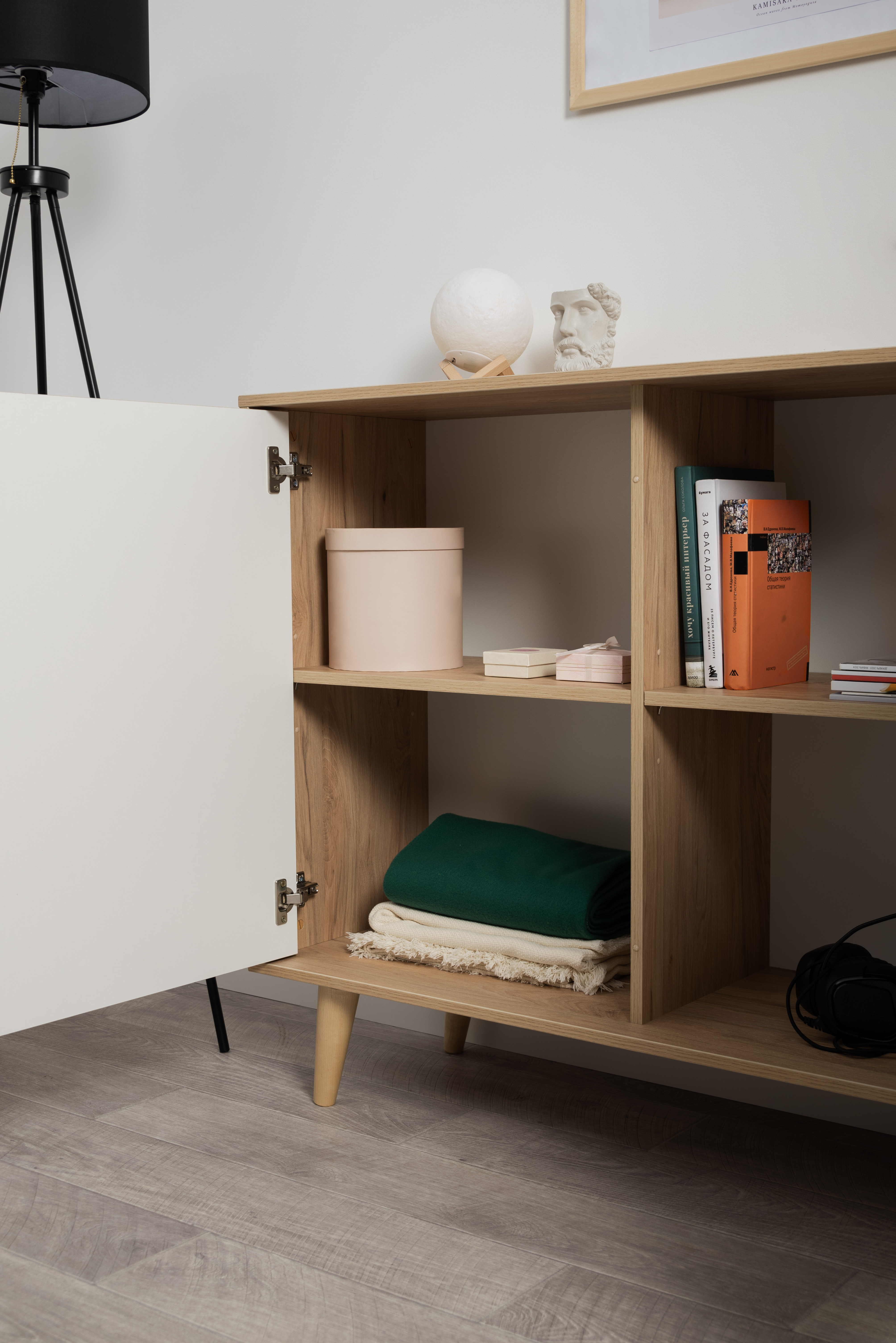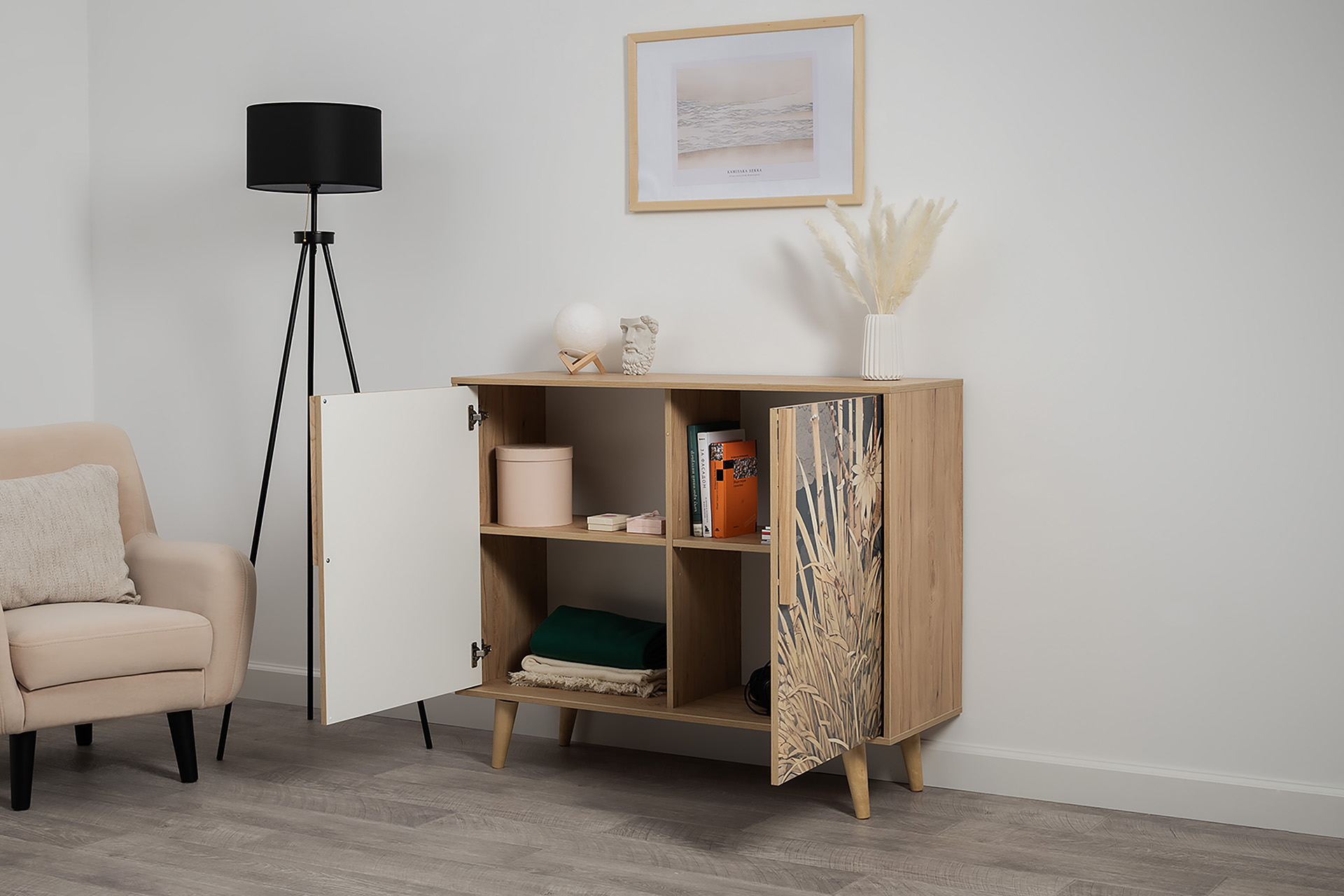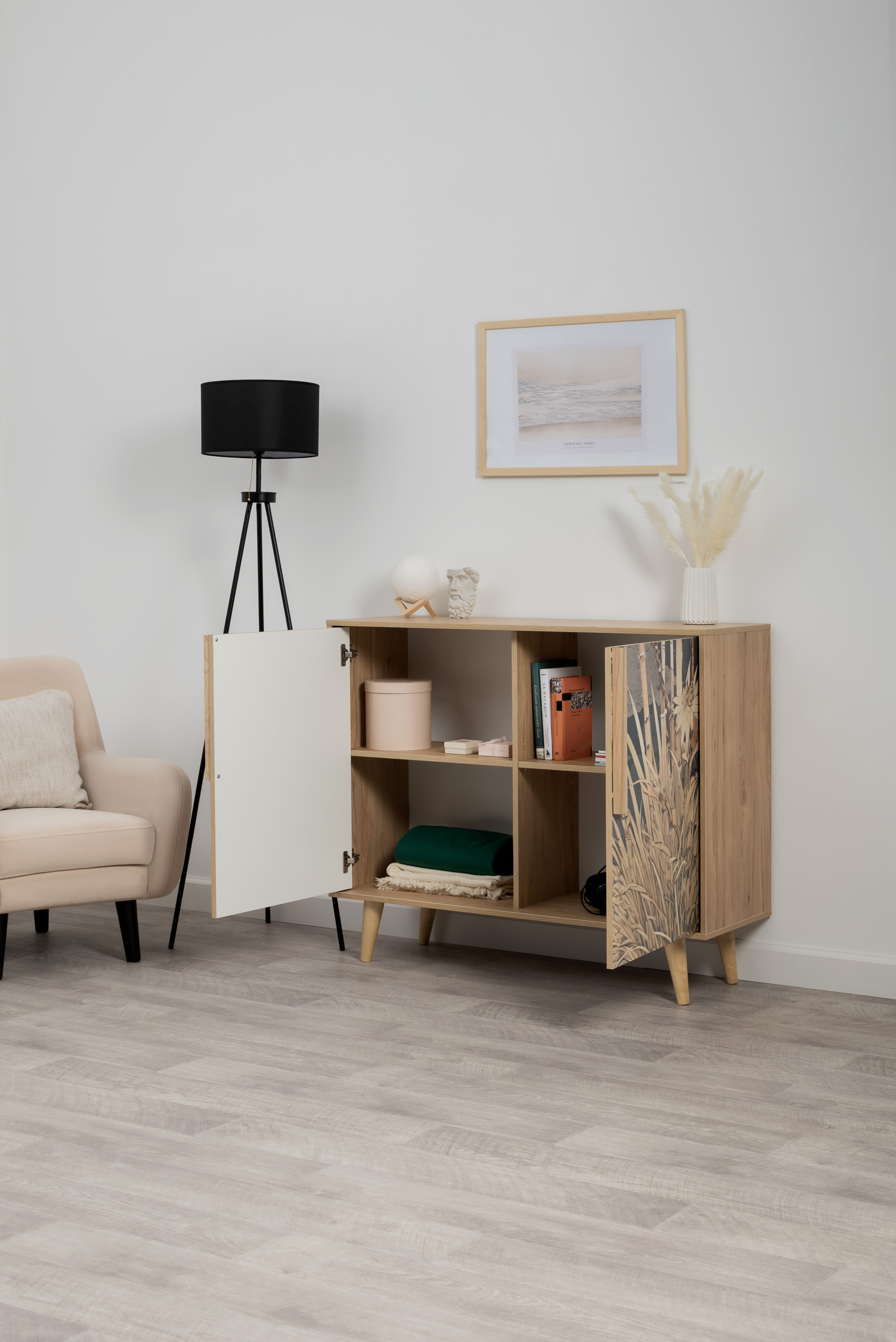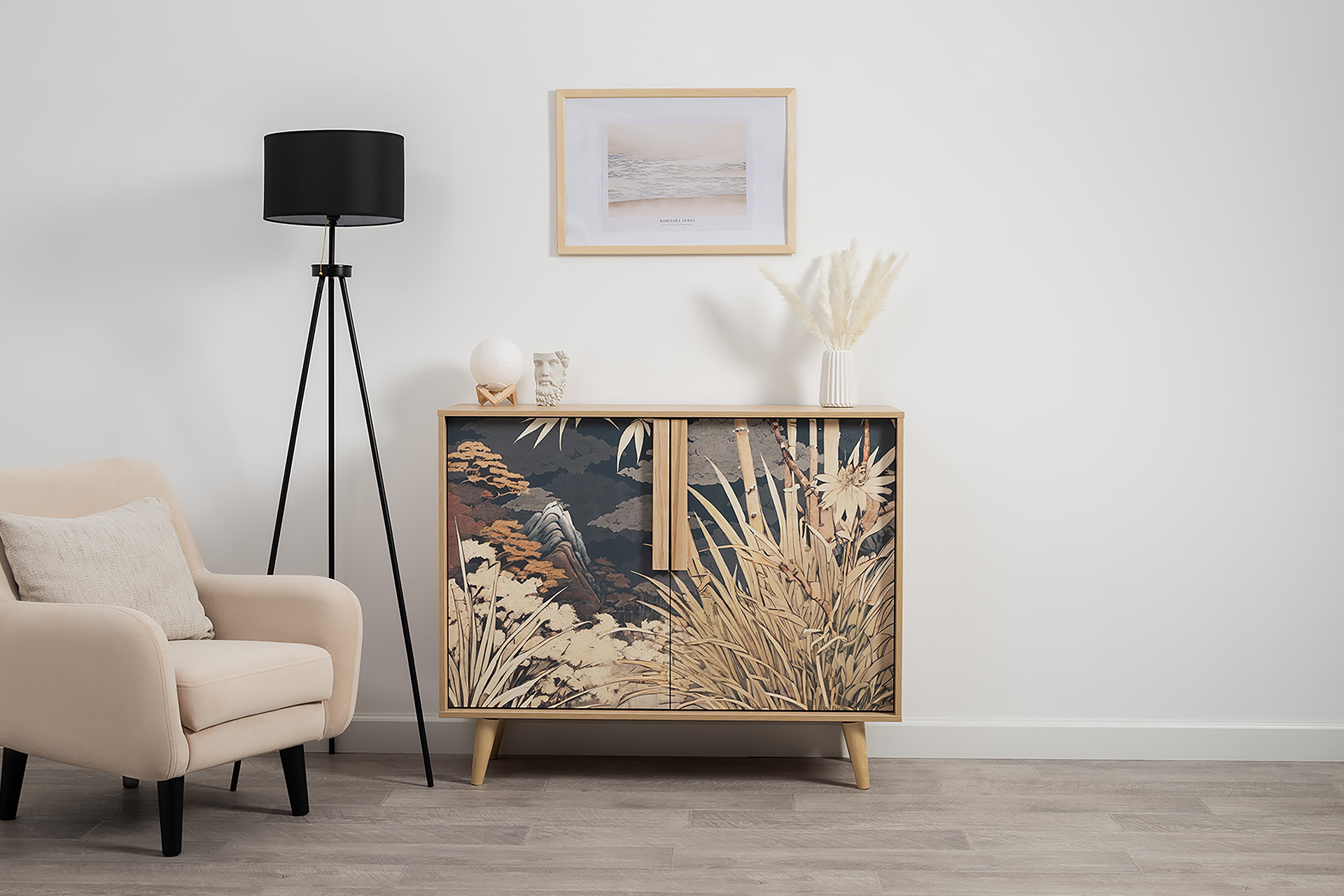 Комод Току 16.230.04 украшают фасады с фотопечатью в восточном стиле, и дополняют ручки и опоры из массива дерева. Вместительные отделения со съемными регулируемыми полками обеспечивают удобное хранение, а углубленные фасады придают конструкции стильную глубину.