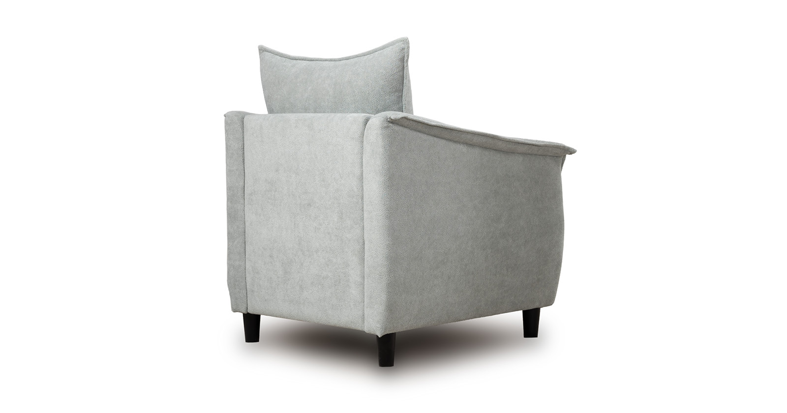 Кресло с приспинной подушкой трапецивидной формы на молнии, по трем сторонам которой проложена отделочная строчка на 1,2 см. По контуру боковин проложен декоративный кант на 1,2 см основной ткани. Кант проходит по центру передней части боковины, а по внутренней верхней части сборка.