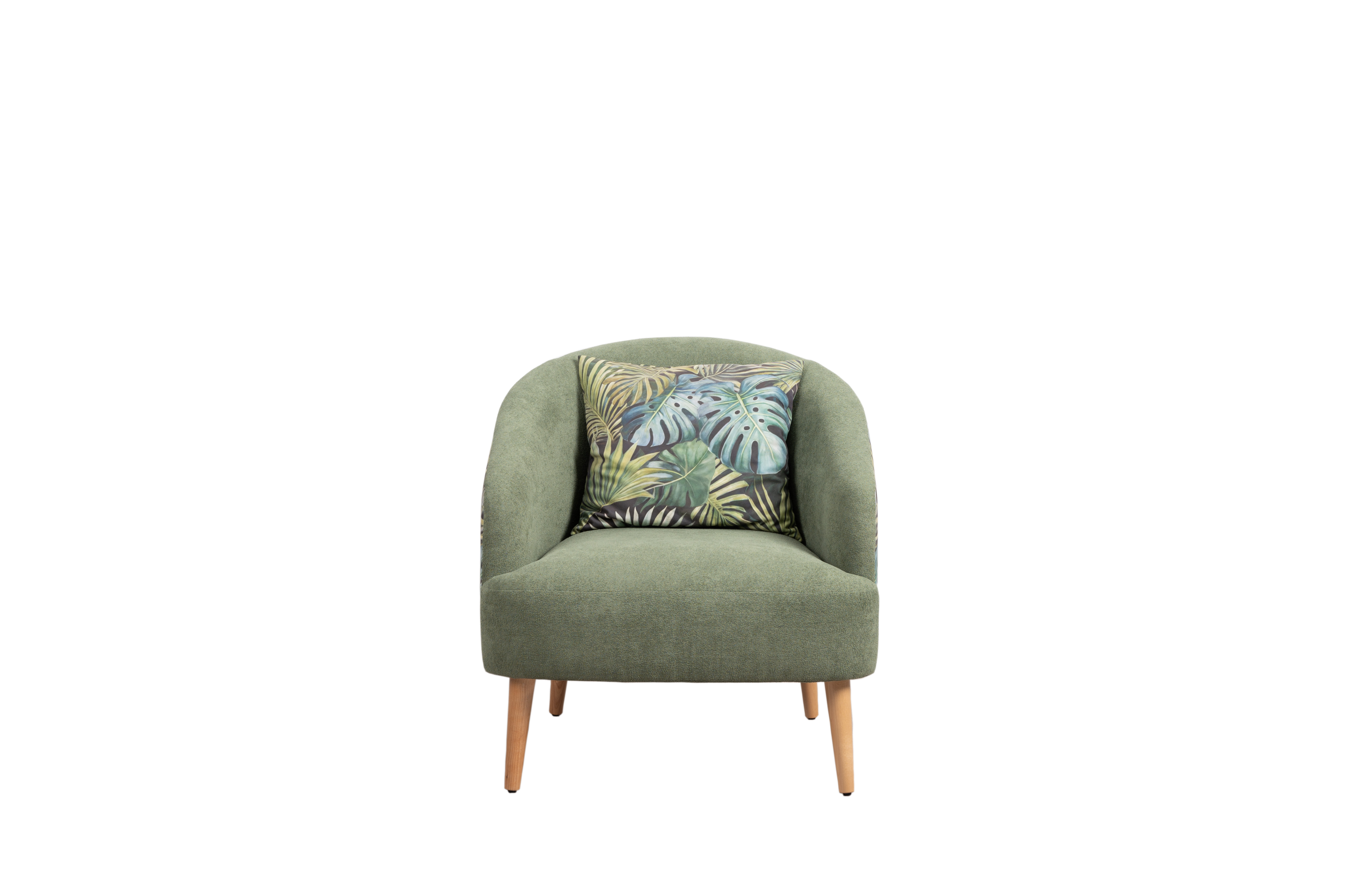 Кресло для отдыха на деревянных опорах. Спинка округлой формы переходящая в боковины. Кресло с подушкой думкой квадратной форы из ткани компаньон.