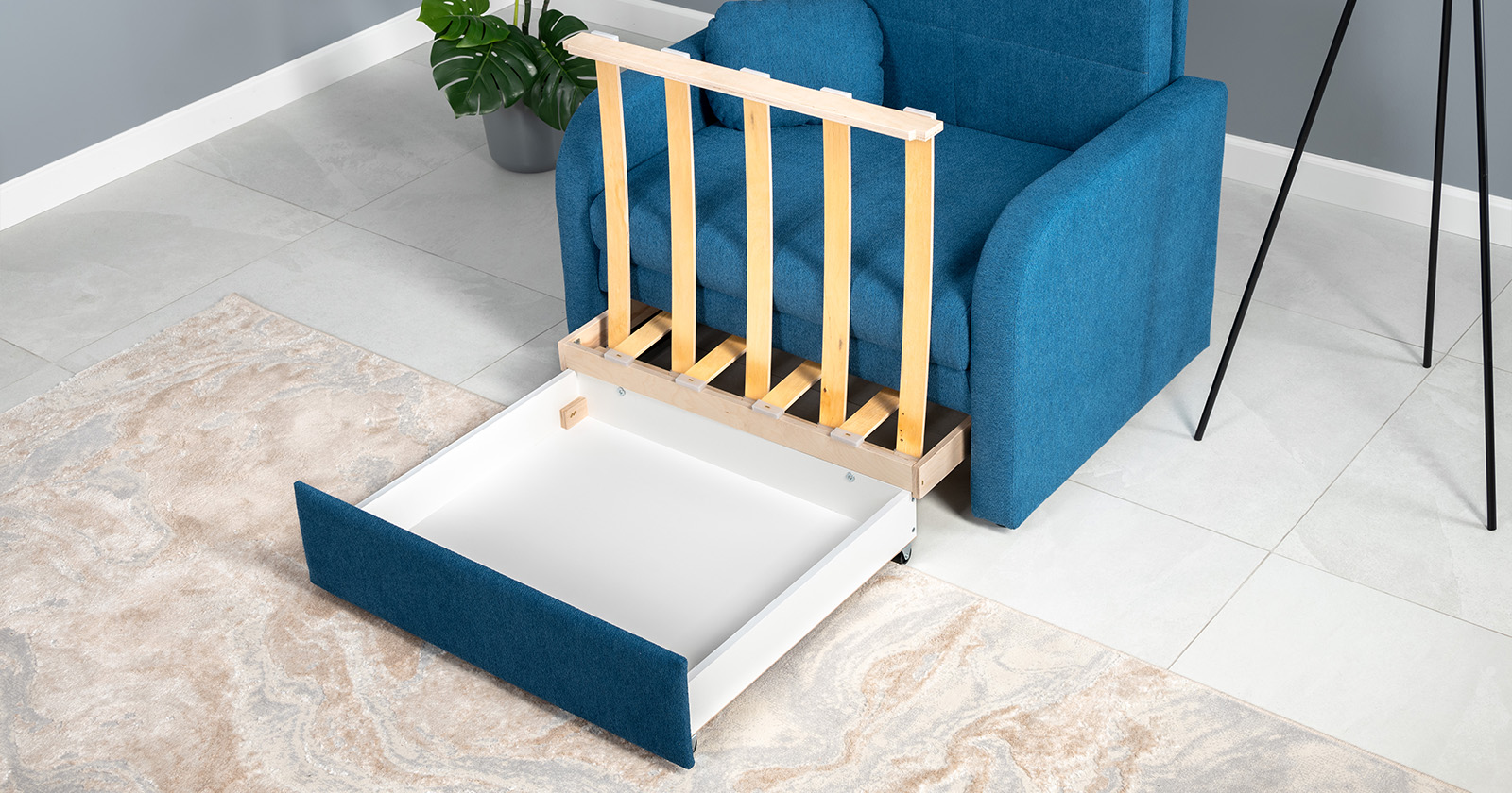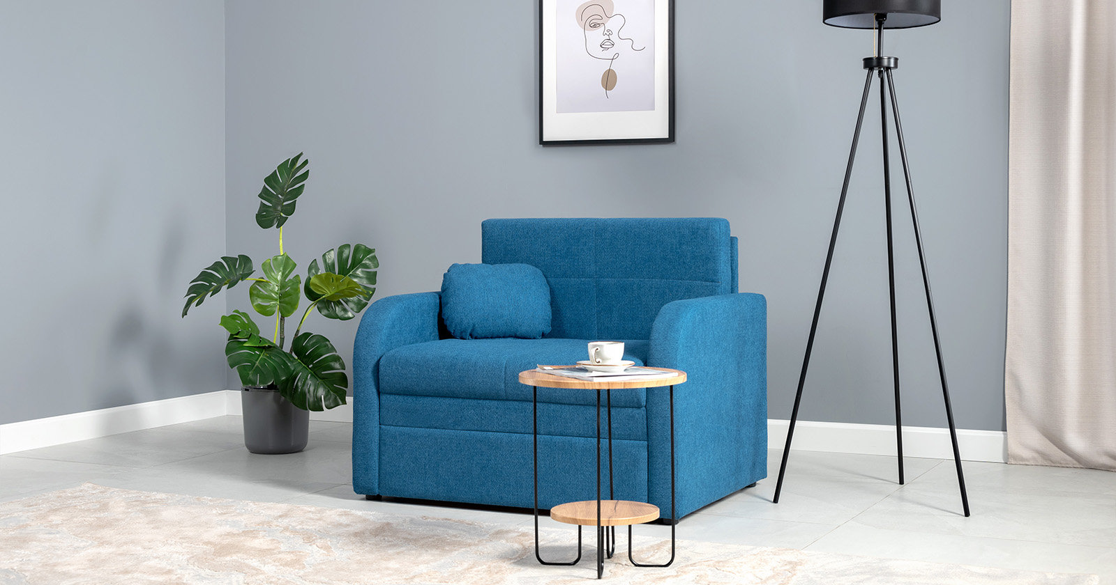 Коллекция выполнена в современном минималистичном стиле с мягкой обивкой из износостойкой ткани и декоративной стежкой, подчеркивающей геометрию форм. Механизм трансформации обеспечивает дополнительное спальное место, делая мебель не только эстетичной, но и максимально функциональной для небольших пространств.