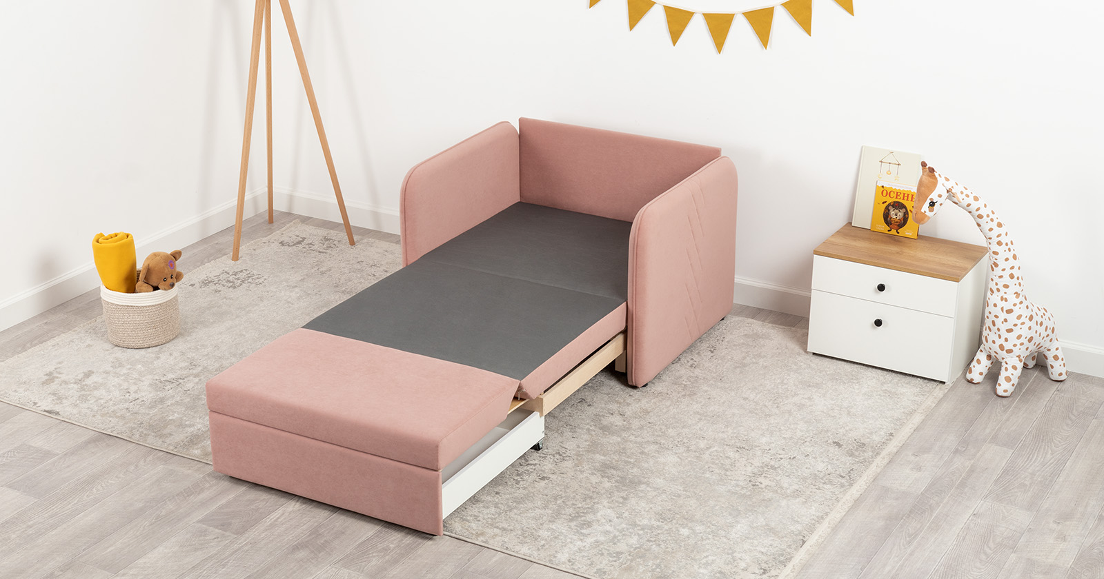 Стильный компактный диван для детской и гостиной. При своих скромных размерах он трансформируется в полноценное спальное место для детей и подростков. Лаконичный дизайн в виде декоративной стежки подчеркивает фактуру велюра, а небольшие размеры позволят разместить его в любом пространстве.