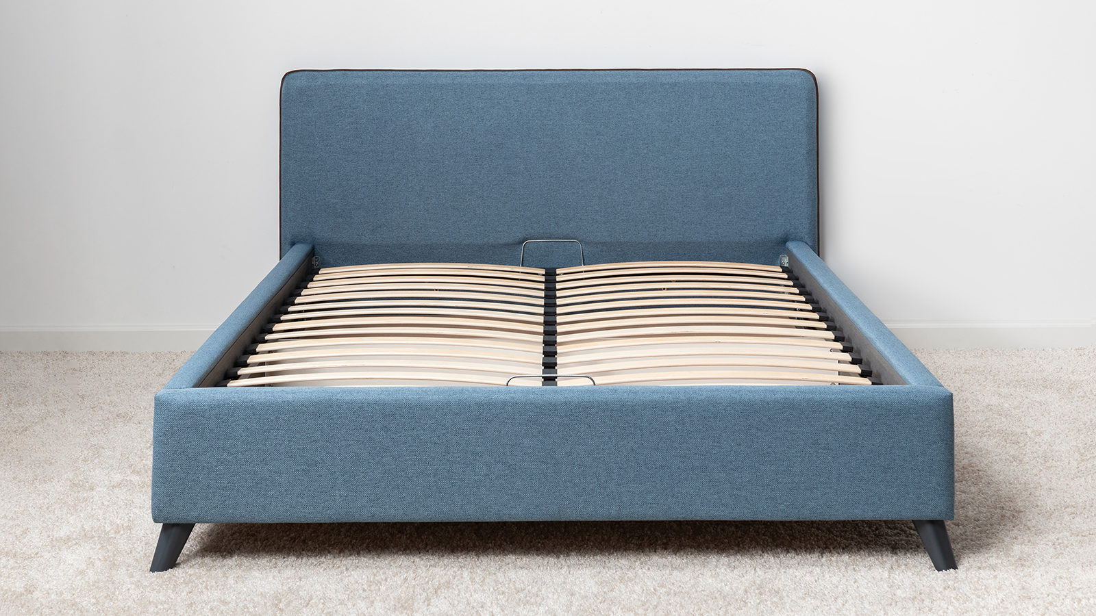 Основание кровати укомплектовано матрасодержателями. Жесткое кроватное дно из МДФ 6 мм. Задняя стенка изголовья выполнена в тех. ткани (спанбонд).