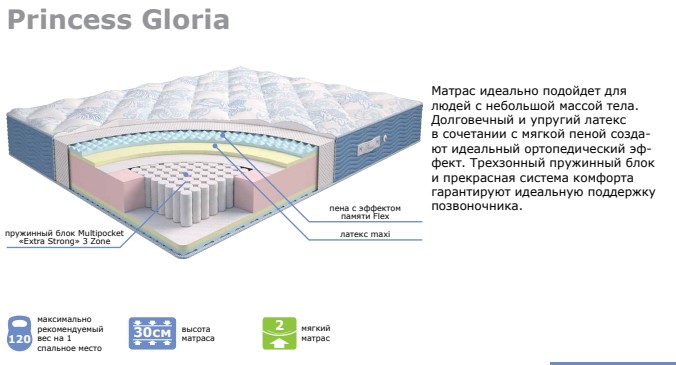 Незабываемые мягкость и комфорт высококачественного матраса сделают ваше спальное место символом уюта, наполнят его атмосферой любви и покоя. Добавьте немного воображения, и Ваша спальня, превратится в настоящие королевские покои. Мягкий матрас на основе трехзонного пружинного блока Extra strong 3 Zone. Основной наполнитель – натуральный латекс, очень упругий и долговечный материал. Система комфорта Maximum с высококачественным бельгийским трикотажем создает прекрасные условия для комфортного сна.