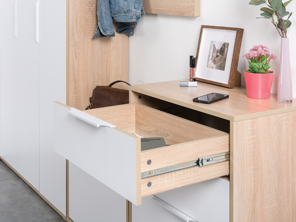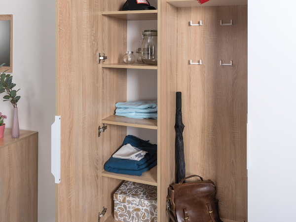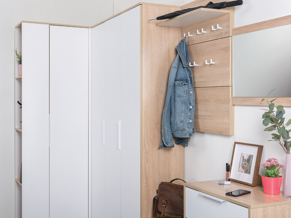 В линейке присутствуют модули с нестандартной конструкцией, которые не оставят без внимания узкие углы, повышая вместимость прихожей в разы.