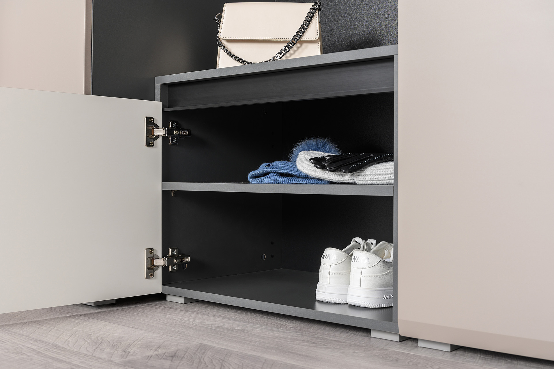 Тумба для обуви Сидней 16.129 антрацит, веллюто капучино ПВХ (универсальная сборка)