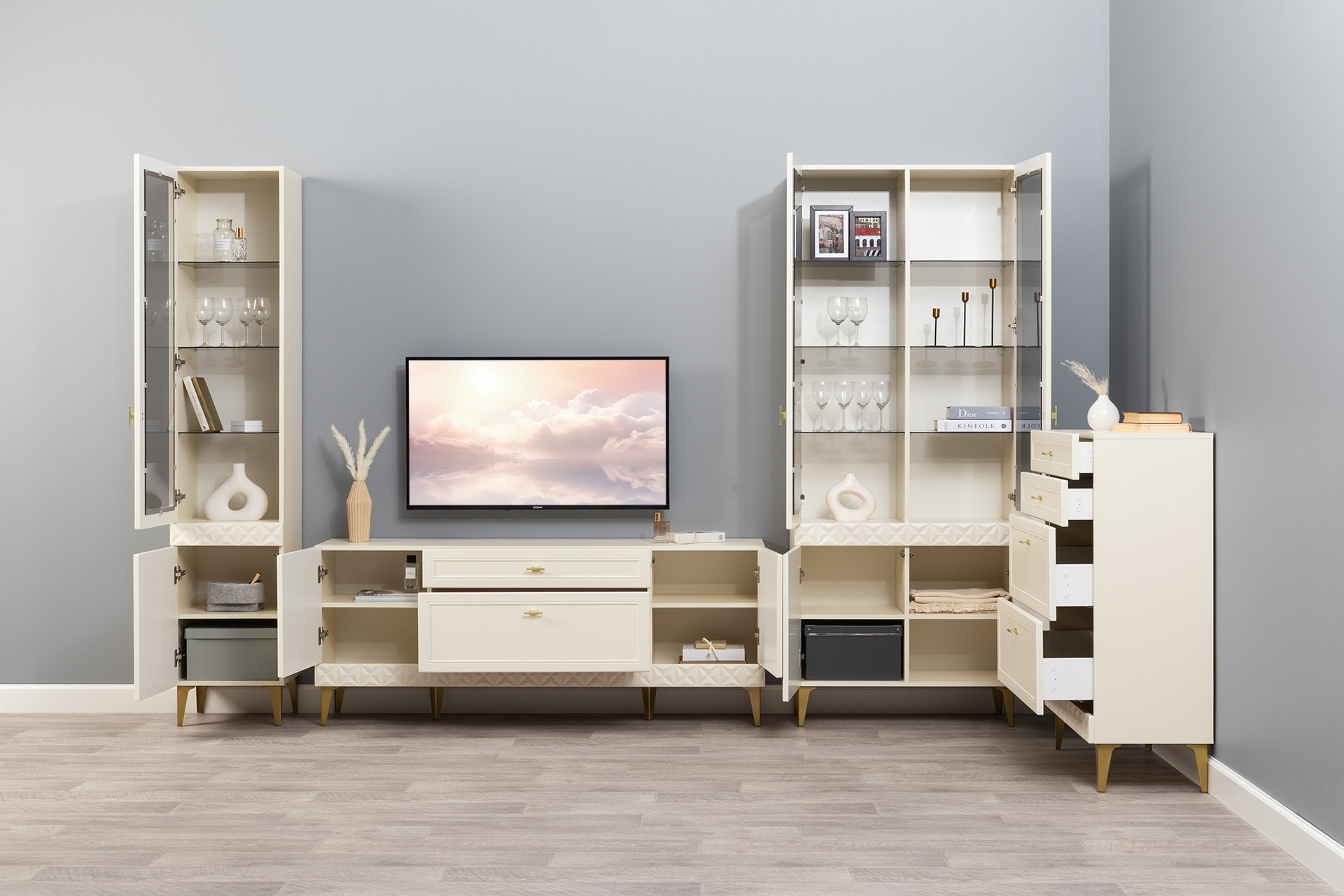 В коллекции представлены три типа витрин с тонированным закалённым стеклом, которые придают пространству лёгкость и свет. «Марион» — идеальное сочетание традиций и актуального дизайна в каждой детали.