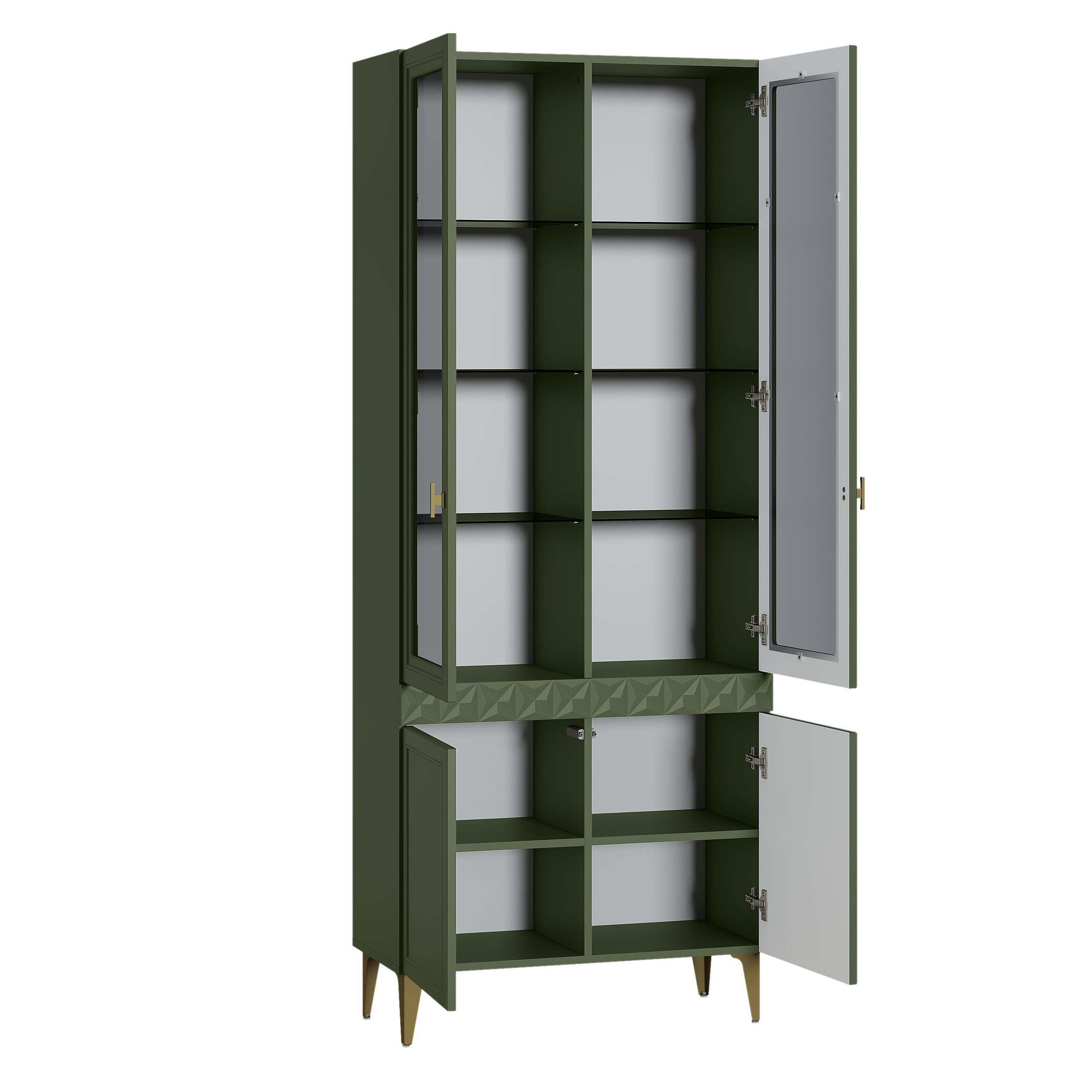 Шкаф-витрина Марион 16.397.02 дымчатый зеленый K521, олива шагрень AG 1050 ПВХ (собирается на любую сторону)