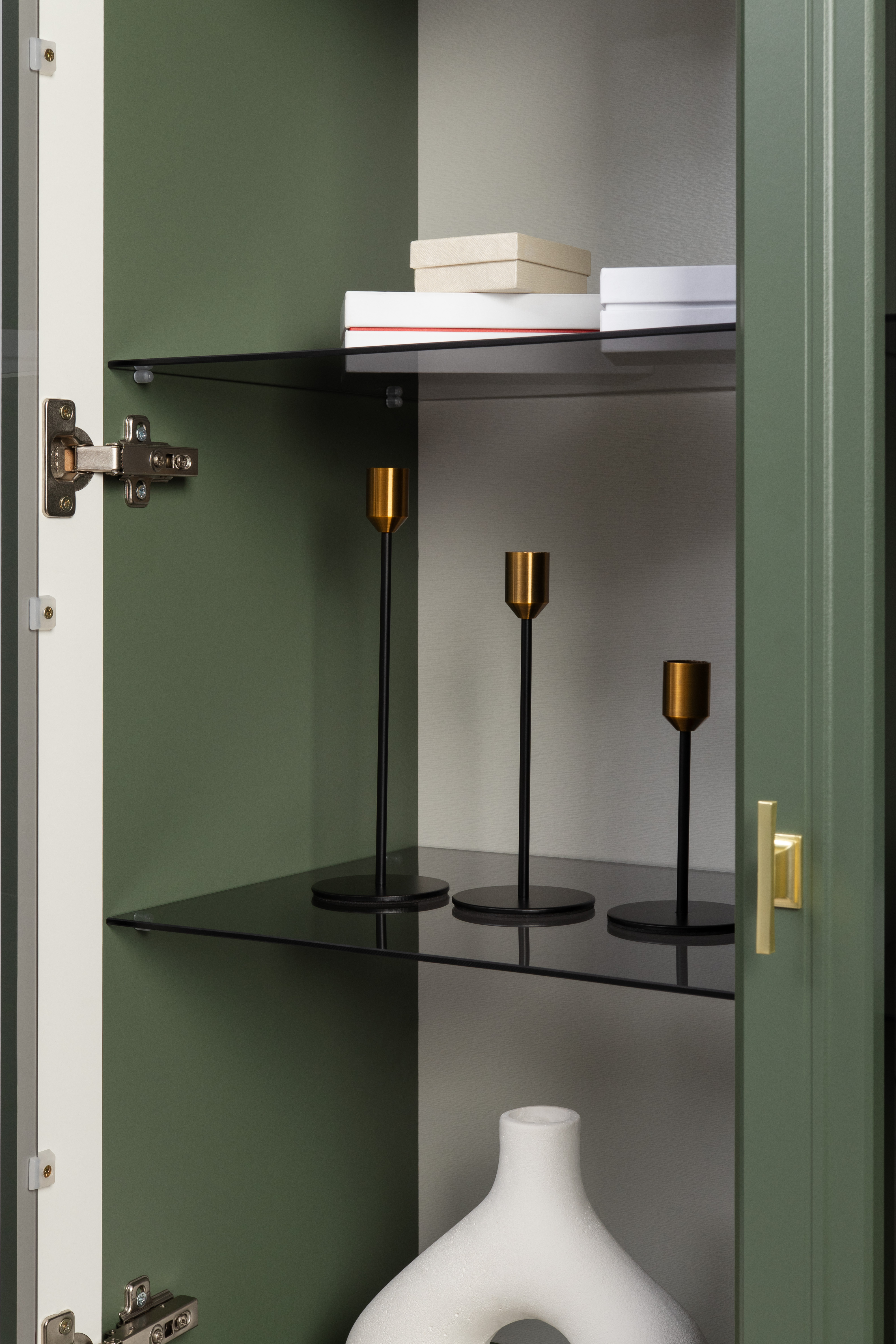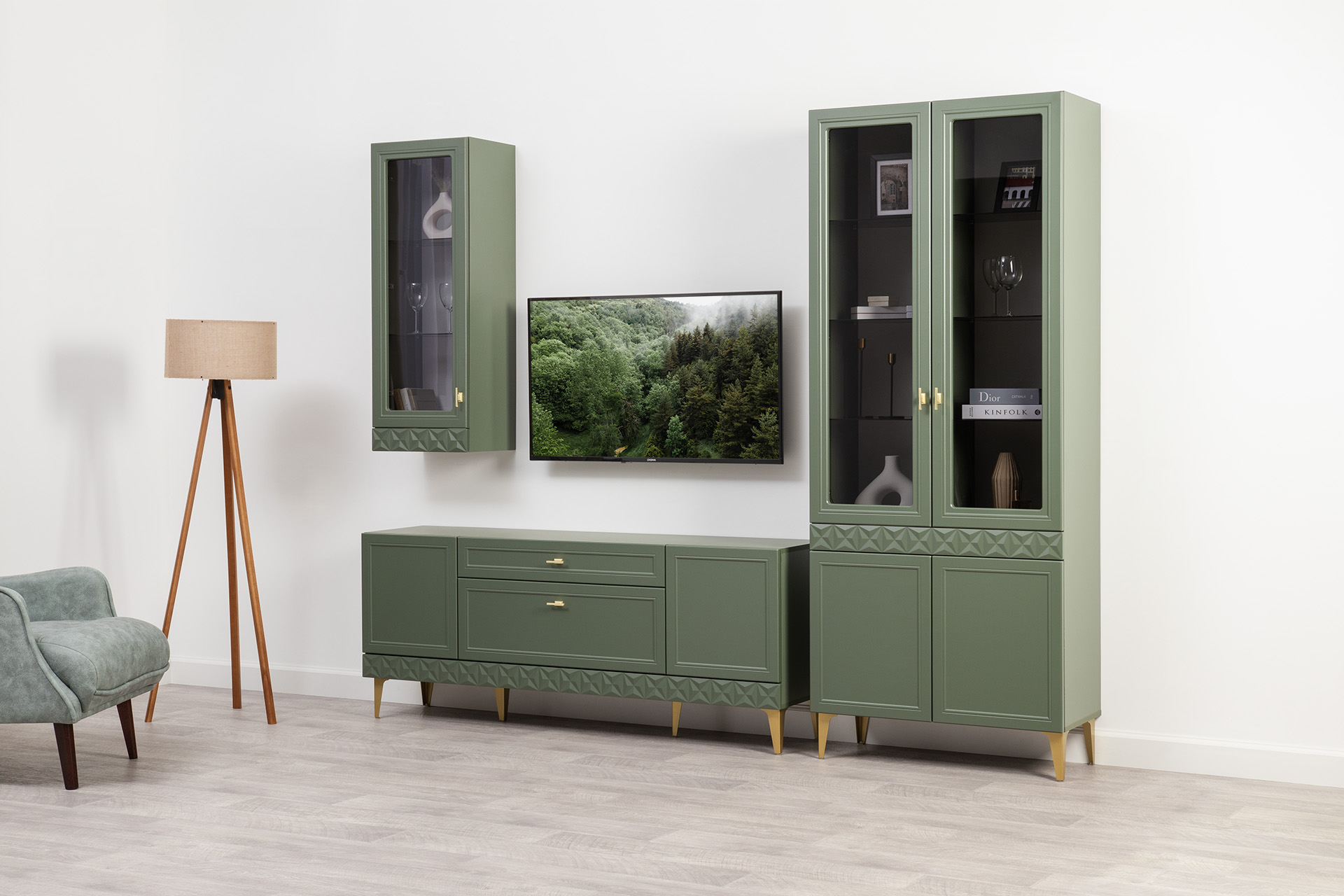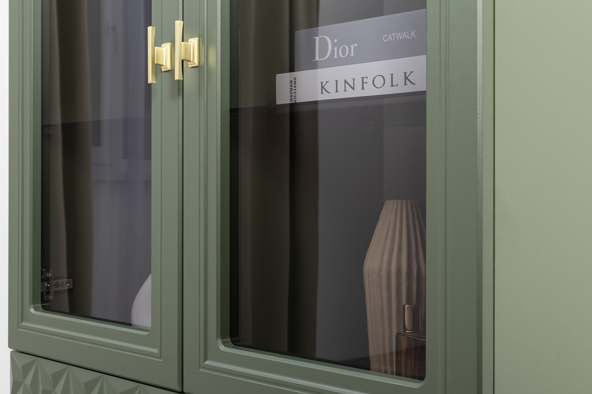 Изящные линии, глубокая фрезеровка фасадов из МДФ и благородные оттенки. Утончённая «Слоновая кость» и изысканная «Олива Шагрень» с глубоким зелёным тоном — создают атмосферу уюта, тепла и благородства. Металлические ручки и опоры золотого цвета придают мебели утончённый блеск, а петли и направляющие с доводчиками обеспечивают плавное и бесшумное закрытие фасадов.