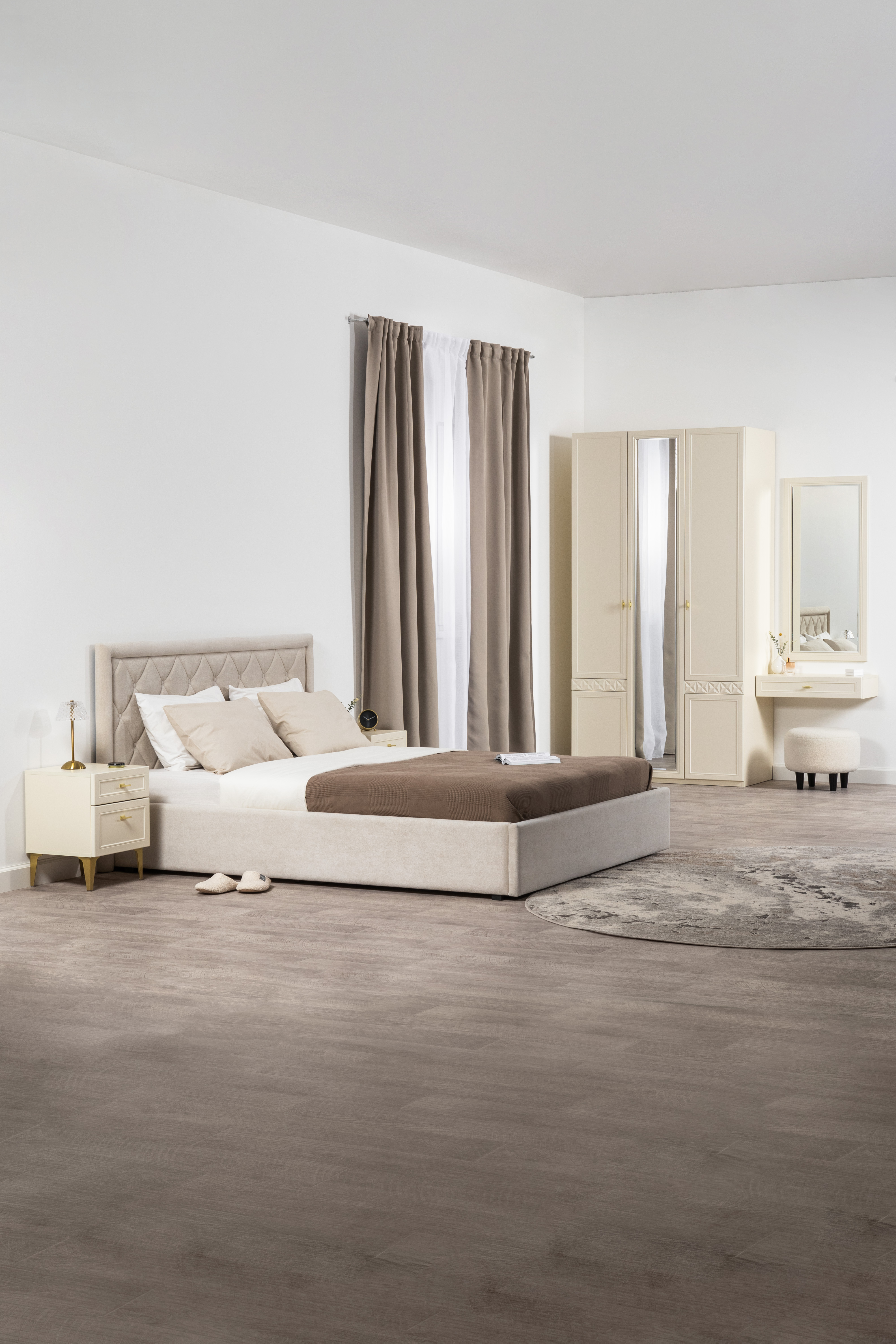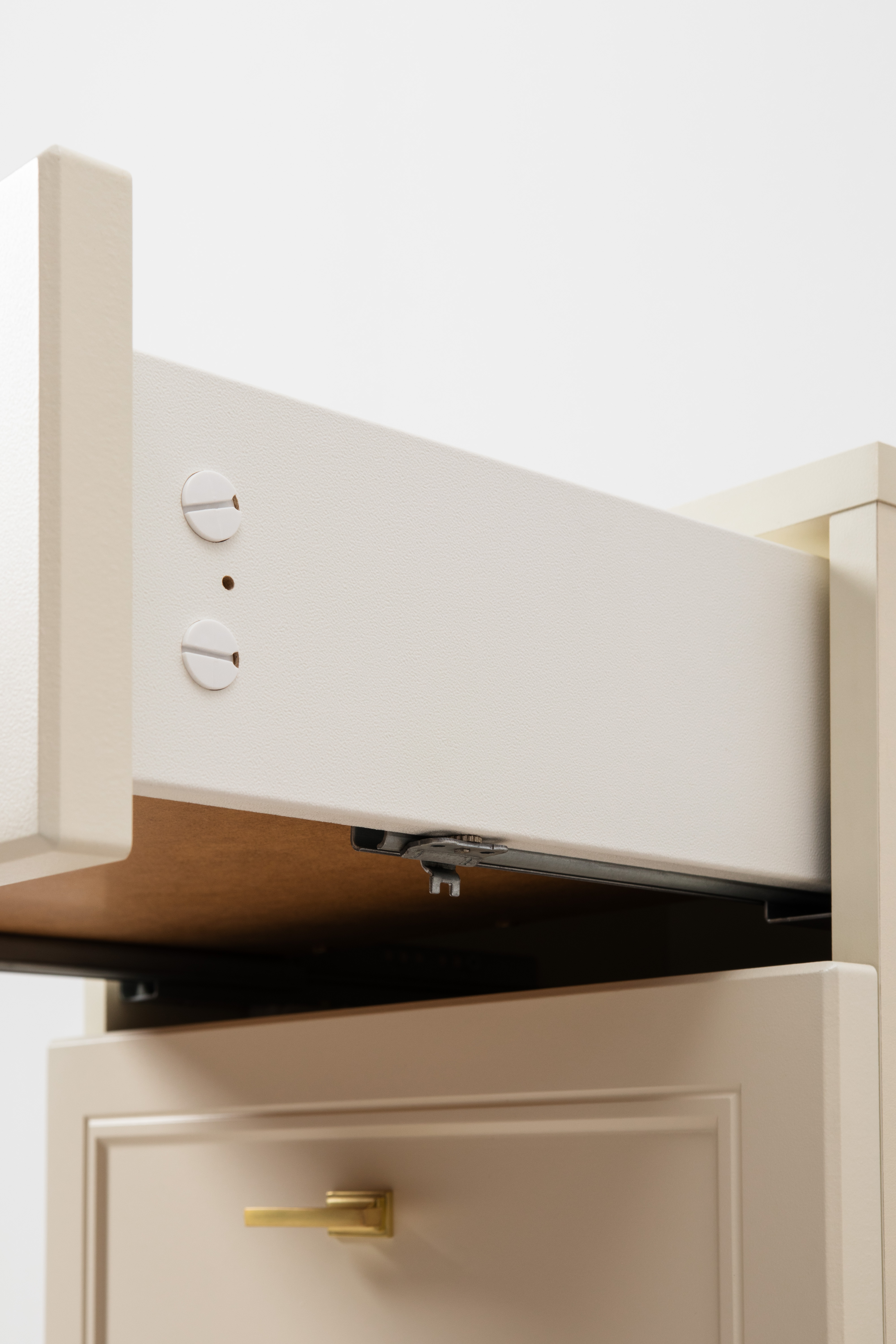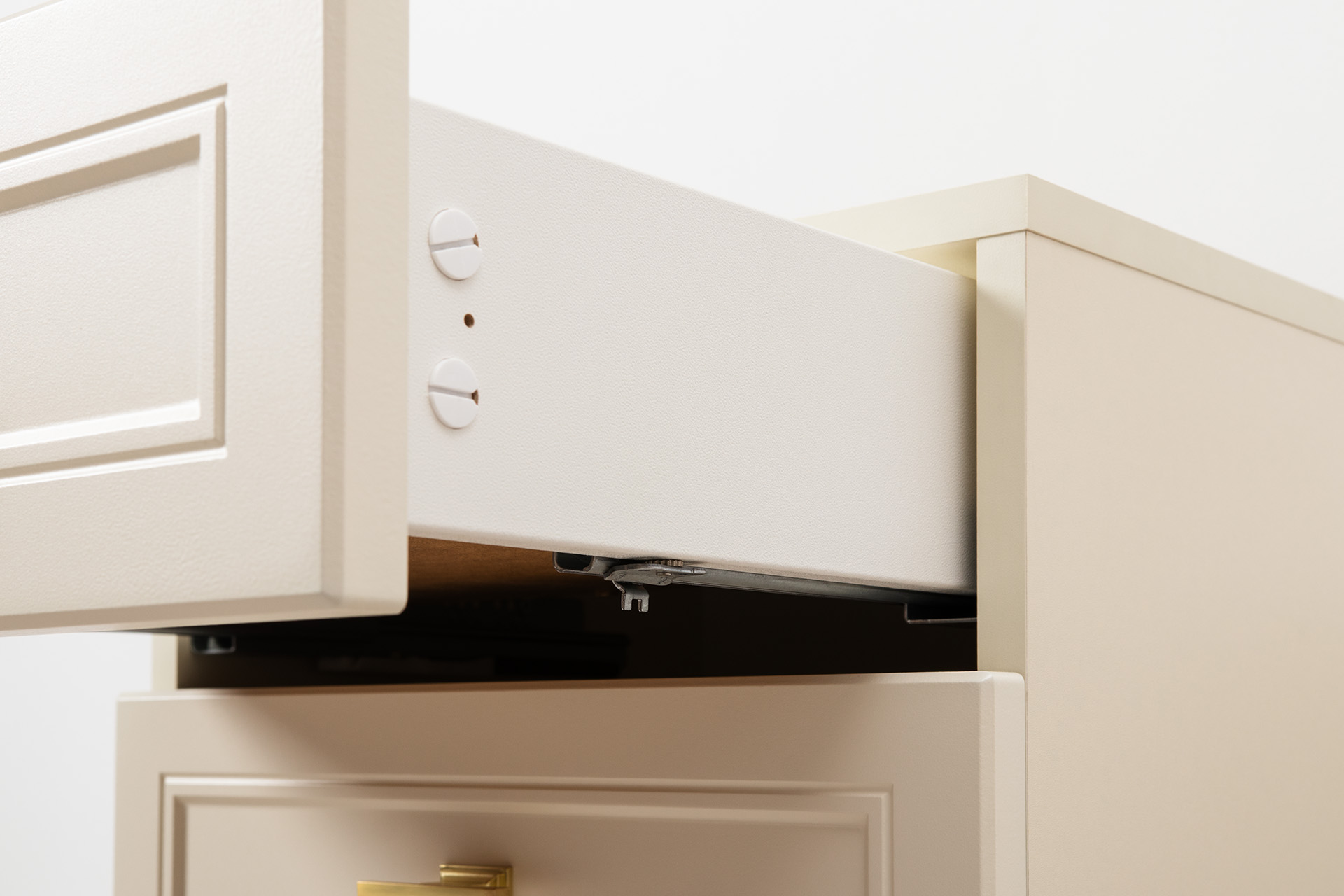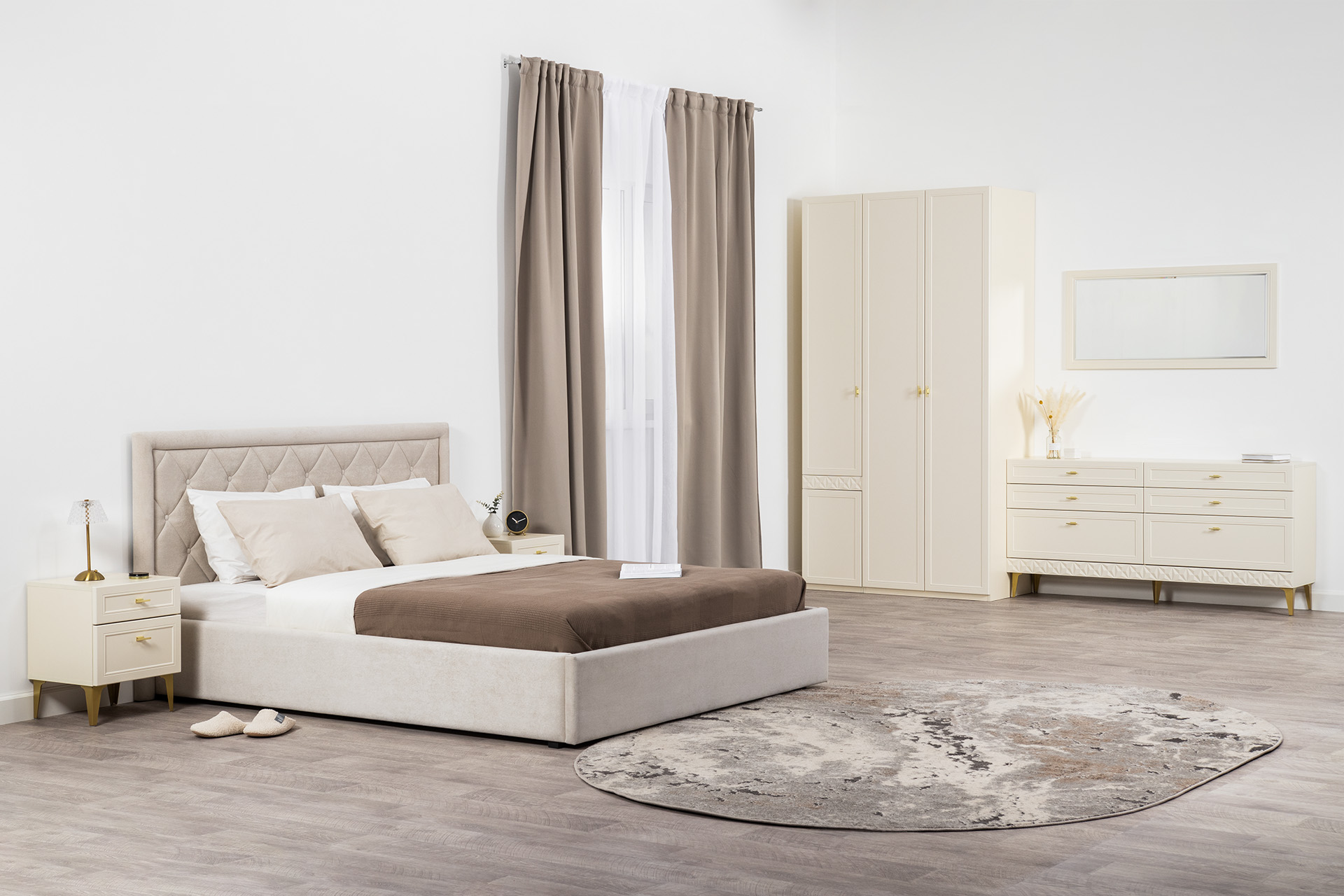 Изящные линии, глубокая фрезеровка фасадов из МДФ и благородные оттенки. Утончённая «Слоновая кость» и изысканная «Олива Шагрень» с глубоким зелёным тоном — создают атмосферу уюта, тепла и благородства. Металлические ручки и опоры золотого цвета придают мебели утончённый блеск, а петли и направляющие с доводчиками обеспечивают плавное и бесшумное закрытие фасадов.