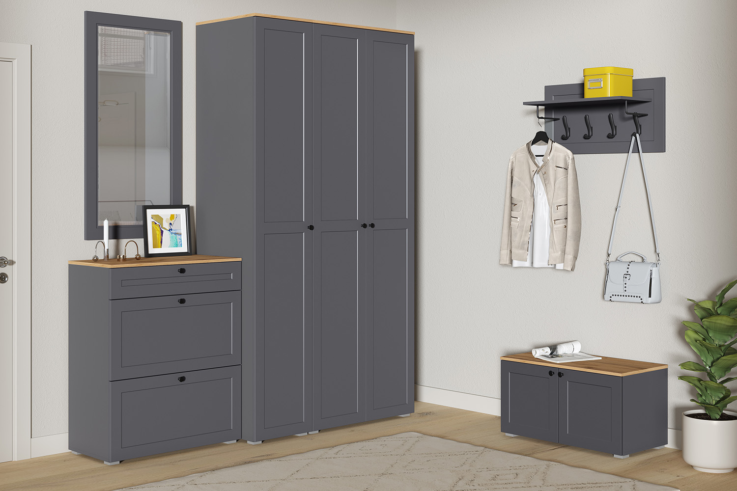 Прихожая доступна в двух цветовых решениях – белый/графит в сочетании с теплым древесным декором.